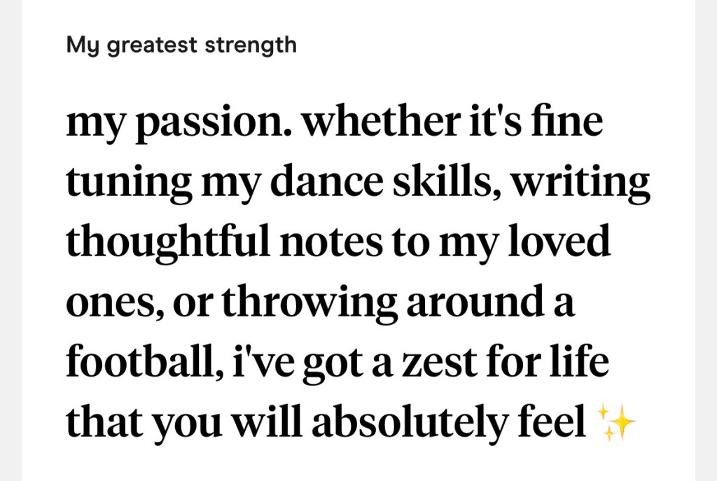 - I added this to my dating profile a while ago. I’m going to delete the apps (again lol. They’re utterly soul sucking! I can discern the difference now!), but I screenshotted this to add to my memory banks. When I wrote it, I genuinely wanted to dance in the kitchen with my future husband and kids. I’ve always loved dance. But dance means so much more to me now. Yes, bopping around and singing/screaming to music is a blast. And, dance now means moving well. Honoring the body’s shape and mechanics and structure. Connecting all the body parts and letting ’em do their thang! I’m not saying to be restrictive about it, but rather, to find the freedom in the structure of what we naturally already are. It’s so much fun to learn and improve on what the body can DO! Now my scary-to-admit-because-it-feels-too-tender-and-vulnerable wish is to daaance with my husband. I mean like, reeeally DANCE. Flow. Be in sync. Create the experience as we go. Dance in the kitchen. Dance in the car. Dance in the aisles at the grocery store. Dance on hikes without falling off the trail. Dance at the beach. Dance in our tent. Dance in the bedroom. Not like jackhammers (hahaha oh man, that observation is another story), but with the finesse, maturity, and elegance of deeply attuned lovers. Flat out – I want to *daaance* with my husband. Lay my head on his chest. Look him in the eye. Let myself be seen by him. And then to think about being pregnant and a vessel for life, dancing with our children in my womb between us, and then dancing with them Earthside and shepherding them as they learn to move their bodies. Aaah I find myself squealing and kicking my feet in the air letting myself dream this!